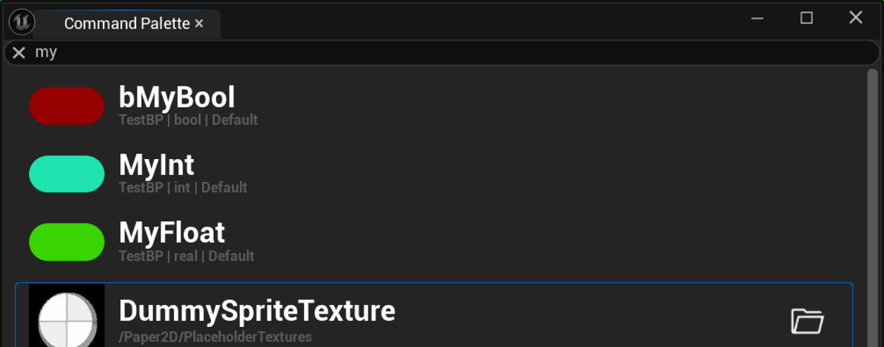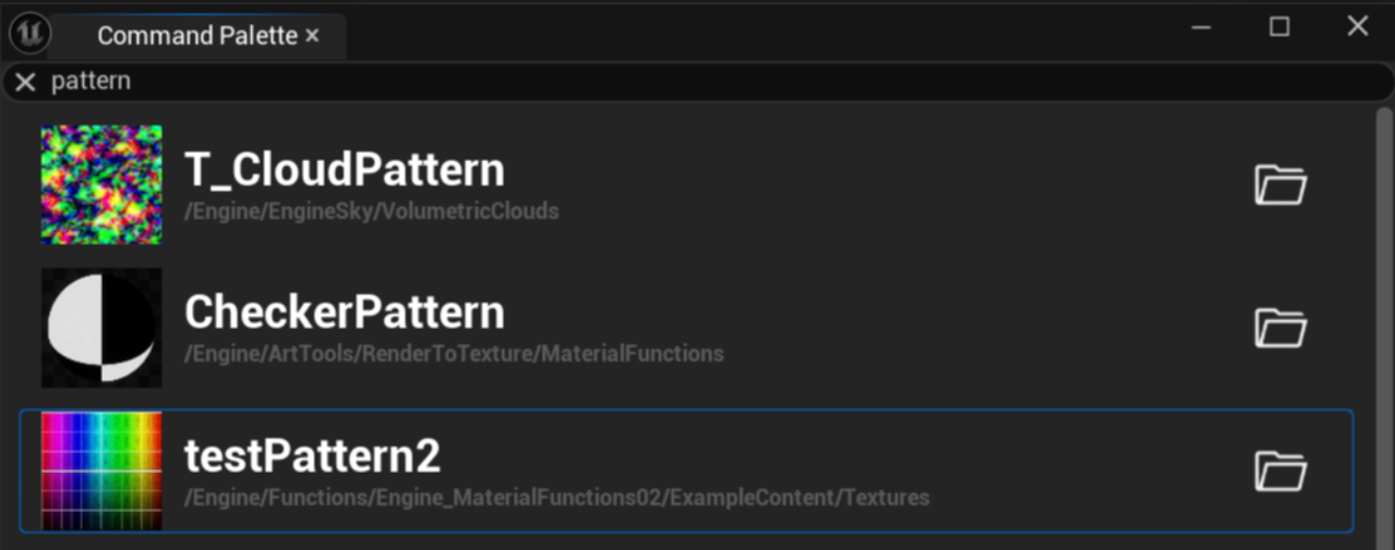 Instantly search for assets in your Unreal Engine project and open them directly from the Command Palette window.