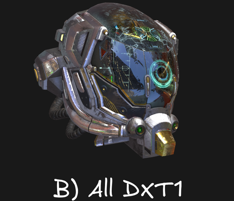 As said before, we are losing quality when using S3TC. Sometimes this loss is not noticeable. Image below shows the difference between all textures using PNG, all using DXT1, and all using DXT1 except the normal map.